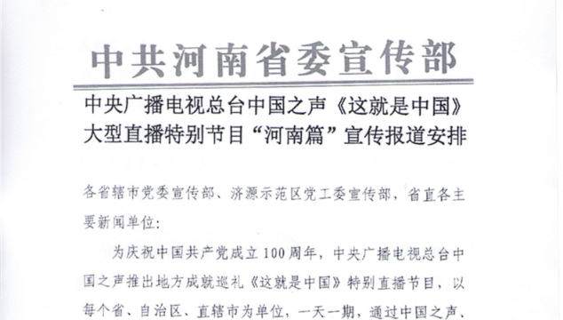 中央廣播電視總臺(tái)中國之聲《這就是中國》大型直播特別節(jié)目“河南篇”宣傳報(bào)道安排
