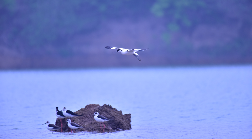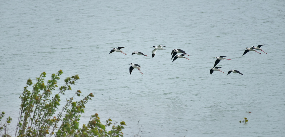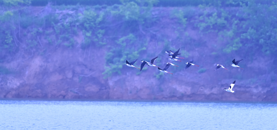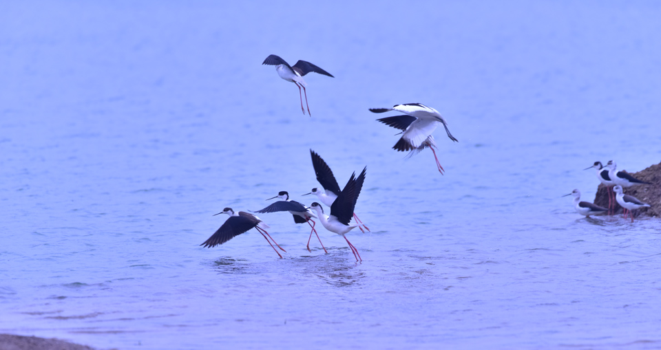 記者發(fā)現(xiàn),這一群鳥約有20只,大紅的長(zhǎng)腿,尖尖的黑嘴,黑翅長(zhǎng)腳鷸身著潔白羽衣,時(shí)而在水邊優(yōu)雅踱步,時(shí)而凌空飛翔,姿態(tài)優(yōu)雅,氣質(zhì)非凡。