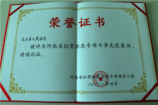 掃黑除惡專(zhuān)項(xiàng)斗爭(zhēng)開(kāi)展以來(lái),沈丘法院嚴(yán)格貫徹中央和省、市、縣關(guān)于深化掃黑除惡專(zhuān)項(xiàng)斗爭(zhēng)的決策部署,不斷提高政治站位,及時(shí)調(diào)整主攻方向,明確重點(diǎn)任務(wù),聚焦依法嚴(yán)懲、“打財(cái)斷血”和專(zhuān)項(xiàng)治理工作,在掃黑除惡專(zhuān)項(xiàng)斗爭(zhēng)中取得了優(yōu)異成績(jī)。近日,沈丘法院被河南省掃黑除惡專(zhuān)項(xiàng)斗爭(zhēng)領(lǐng)導(dǎo)小組授予“掃黑除惡專(zhuān)項(xiàng)斗爭(zhēng)先進(jìn)集體”稱(chēng)號(hào)。