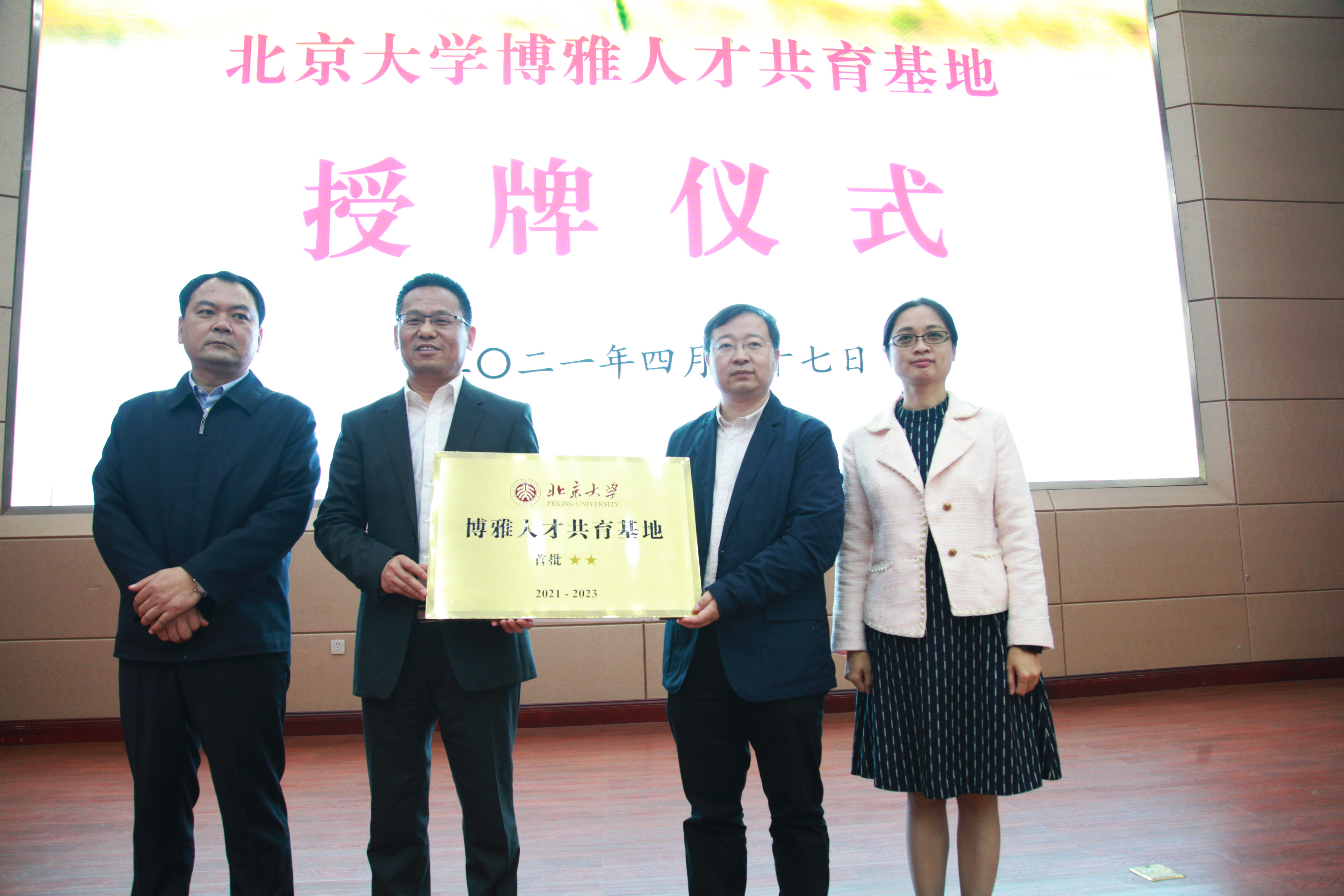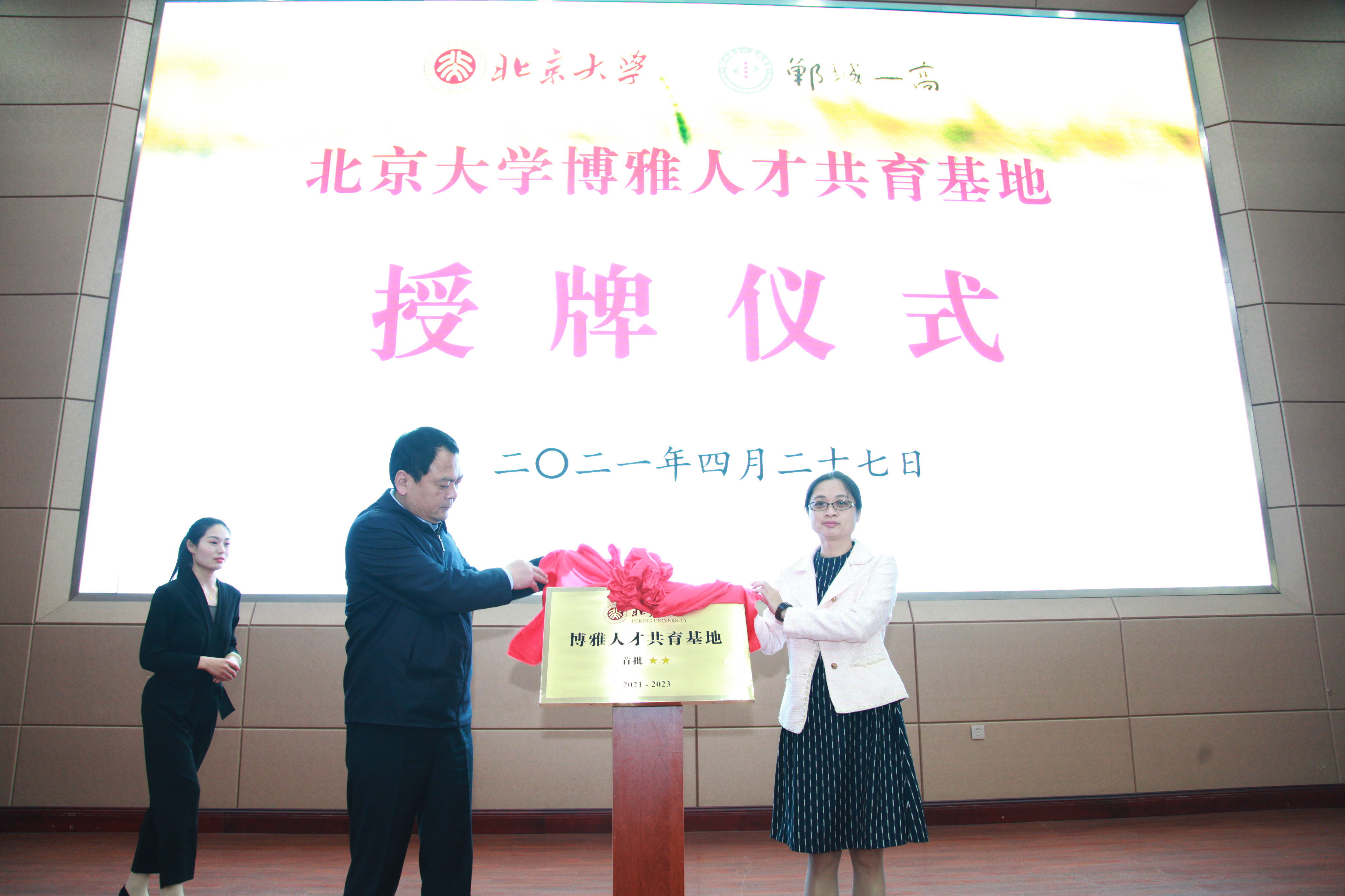 林莉、李全林共同為北京大學(xué)“博雅人才共育基地”揭牌,周江向鄲城一高校長劉成章授牌。