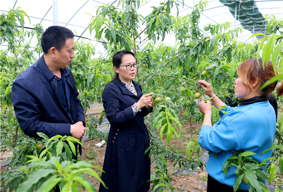 圖為張福麗博士查看李紅彥家大棚油桃長勢。
