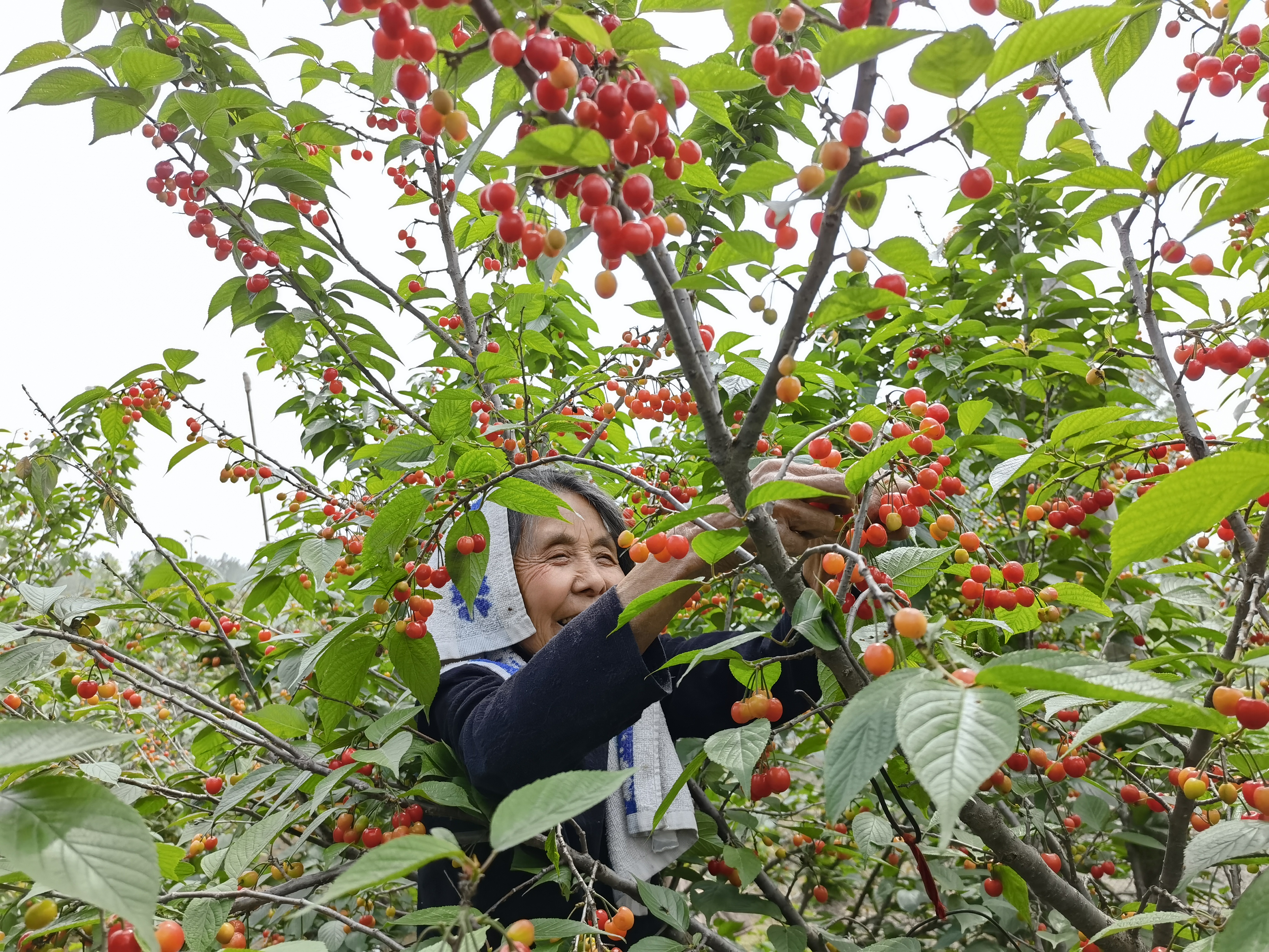 (武灣村86歲高齡老人胡芝榮在采摘櫻桃)