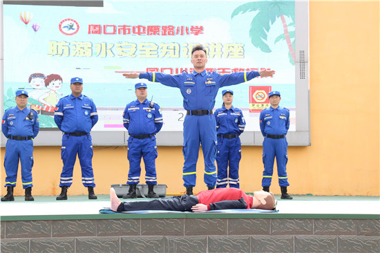周口市川匯區(qū)藍(lán)天救援隊(duì)對(duì)全體師生進(jìn)行防溺水自救互救知識(shí)講座,并現(xiàn)場進(jìn)行急救演練操作。