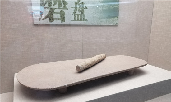 步入輝煌大氣的周口市博物館,走進第一個展廳“宛丘之上”,右手邊第一個獨立展窗中陳列的,便是迄今為止我國發(fā)現(xiàn)時代最早、形制最大的裴李崗文化石磨盤,堪稱“華夏第一石磨盤”。第一眼看去,它并不驚艷,甚至有些平平無奇,有點像現(xiàn)在孩子們玩的“滑板”,也有點像切菜用的案板。實際上,它是周口這片土地上的先民賴以生存、難離難棄的生活工具,常與石磨棒配套使用,用于谷物的脫殼與加工。
