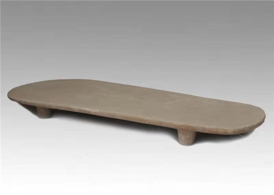 仔細(xì)端詳這臺石磨盤,你會發(fā)現(xiàn)它的做工竟如此規(guī)整:由整塊黃砂巖磨制而成,長100厘米,大頭寬44厘米,小頭寬22厘米,厚3.5厘米,表面平坦,沒有任何凹陷痕跡;兩邊呈直線,四角略呈弧形,底部也很平整,還有4個圓柱狀、支撐用的足,足長5厘米左右。試想,在當(dāng)時生產(chǎn)工具極度落后的時期,要制作如此大而規(guī)整的一個石磨盤,需要耗費多么大的勞動量,需要花上多少年的時間,才能打磨出這么平坦光致的效果?也正因如此,石磨盤成為當(dāng)時先民的貴重財產(chǎn)。