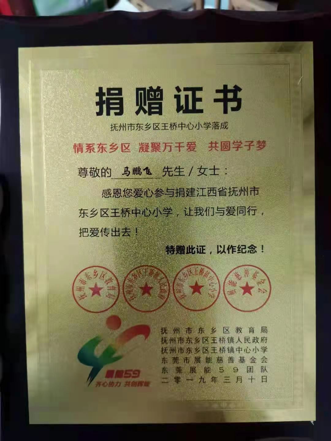 2019年,馬鵬飛出資數(shù)萬元,參與捐建了江西省撫州市東鄉(xiāng)區(qū)王橋中心小學,凝聚愛心,共圓老區(qū)學子夢。3月,撫州市東鄉(xiāng)區(qū)教育局、撫州市東鄉(xiāng)區(qū)王橋鎮(zhèn)人民政府、王橋鎮(zhèn)中心小學,為馬鵬飛頒發(fā)了捐建證書。
