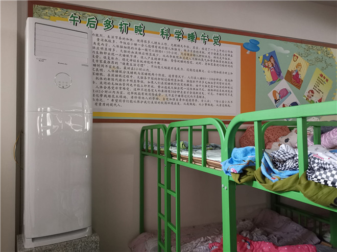 記者看到,午休中心寬敞明亮,美觀大方,干凈舒適。大功率空調(diào)適時開放,空氣清新怡人,午休時,孩子們很快就能進入夢鄉(xiāng)。午休中心的新床一律采用松樹木質(zhì)床板,整屋散發(fā)著樹脂的清香。