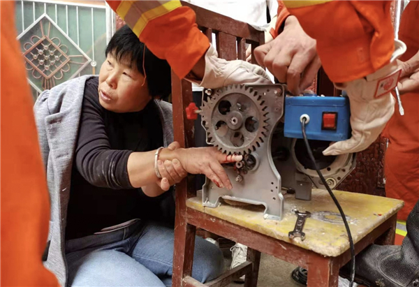 到達(dá)現(xiàn)場(chǎng)后,指戰(zhàn)員發(fā)現(xiàn)一女子的右手食指被卡在壓面機(jī)齒輪中,情況緊急。指戰(zhàn)員迅速制訂救援計(jì)劃,分兩組實(shí)施救援,一組照看被困人員情況,安撫情緒,另一組用手鉗、擴(kuò)張器、手持切割機(jī)等工具對(duì)壓面機(jī)進(jìn)行破拆。經(jīng)過(guò)近10分鐘的處置,成功解救被困人員,并將其移交給醫(yī)護(hù)人員進(jìn)行救治,受到現(xiàn)場(chǎng)群眾的贊揚(yáng)。