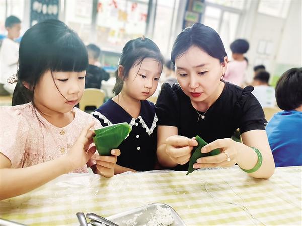 近日,一名幼兒園老師在指導孩子們包粽子。端午節(jié)前夕,周口市市直幼兒園舉辦“迎端午包粽子”活動,旨在培養(yǎng)孩子們的動手能力,激發(fā)勞動熱情,受到孩子們的歡迎。
