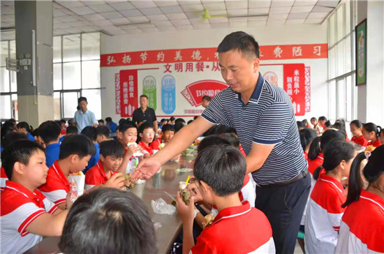 朱玉良、李繼元等詢問后勤處粽子準(zhǔn)備的充足不充足,并走到學(xué)生中去,把散發(fā)著芳香的粽子送到大家手中,一邊叮嚀著說,不夠吃再拿,不過不要浪費。懂禮貌的孩子們雙手從校長手中接過熱乎乎的粽子,連聲說謝謝。