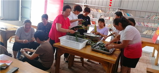6月14日上午,西華縣奉母鎮(zhèn)七二村、前邵村、劉莊村的鄉(xiāng)村大食堂里笑聲不斷,“兩委”干部、文藝宣傳隊員將粽葉、糯米、紅棗、花生等食材仔細洗干凈,一起折粽葉、裝糯米、放餡料、裹扎繩……大家相互指導、相互配合,一派“碧艾香蒲處處忙,誰家兒女慶端陽”的熱鬧景象。