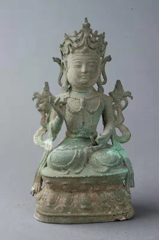 商水壽圣寺塔,高41.5米,為九級樓閣式磚塔。塔體從底至頂漸收勻稱,平面呈正六邊形。塔頂用鑄鐵鑄成葫蘆形寶頂,給人以挺拔雋秀之感。塔的層檐收放尺寸設計精妙,既保護了塔墻免遭雨雪侵蝕,又使塔體顯得莊重肅穆。塔身諸層外壁皆辟有圓券門、破子欞假窗,塔身各角砌出倚柱,檐下密布磚雕斗拱。塔內(nèi)砌出塔心室和盤旋梯道,可逐層登高至塔頂。塔第一層,南面辟門,門楣上刻“明道二年癸酉歲三月一日丙寅時戊寅日,葬舍利院主。僧□□建□□功德塔”。說明建塔的年代是北宋。塔室為穹窿頂。東南、西南兩壁有破子欞盲窗各1個,西壁另辟一拱券門,有踏道可登至第二層塔心室。第二層,南面辟門,東南、西南兩壁各砌一盲窗,東壁另辟一門可沿踏道進入第三層。以上諸層大同小異。第四層,塔心室內(nèi)北墻嵌石雕佛像3尊,兩尊盤膝正面像,一尊盤膝背面像。剎柱下端插入塔心室,上端置鐵質(zhì)寶瓶,在不同部位還發(fā)現(xiàn)“風調(diào)雨順”“國泰民安”“周王千歲千千歲”“大明嘉靖二十八年九月吉日”“河南周府施舍西華小瑤集壽圣寺塔一座”等字樣,這些都說明了明代嘉靖年間,又重修了塔身。1998年9月,在維修該塔時,在天宮清理出明代銅佛像3尊,白釉瓷盤1只,白釉黑花瓷碗、白釉褐花瓷碗各1個,刻印大彌陀經(jīng)1卷。銅佛像高約20厘米,其中一尊有“嘉靖三十一年”字樣,這一時期的周王為周敬王朱在鋌,這說明嘉靖三十一年周敬王朱在鋌為祈福曾將這批器物和經(jīng)卷,置入了塔頂?shù)蔫F質(zhì)寶瓶中。