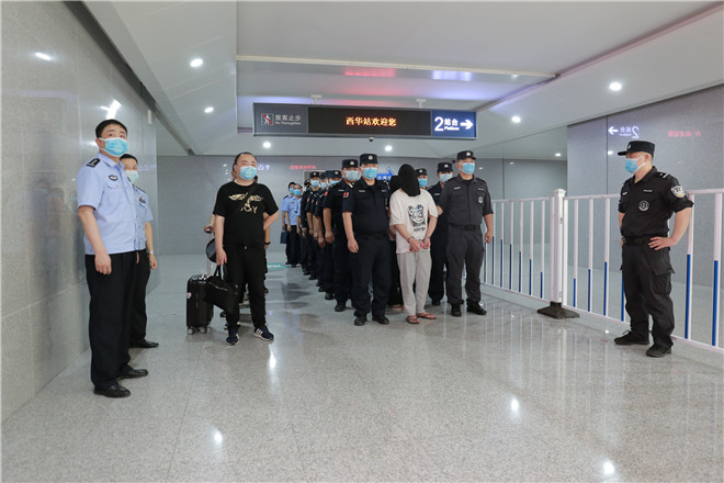 當(dāng)天,西華縣公安局在鄭阜高鐵西華站舉行歡迎儀式,迎接赴西安抓捕組凱旋歸來。特警在站臺上排列整齊、嚴(yán)陣以待,列車準(zhǔn)時停靠到站,7名犯罪嫌疑人隨即被押解下車,全副武裝的特警立即上前進(jìn)行押解交接,押往在高鐵出站口等候的裝甲車上。至此,歷經(jīng)三天三夜,一起電信網(wǎng)絡(luò)詐騙團(tuán)伙案成功告破。