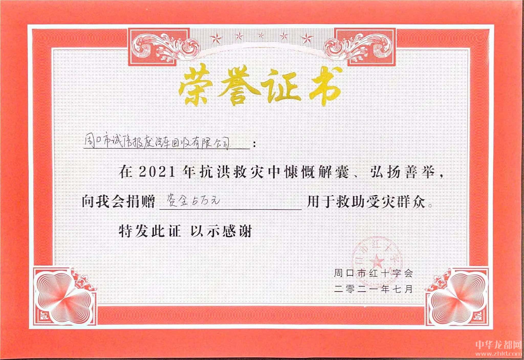 同時(shí),張站國(guó)作為周口市誠(chéng)信報(bào)廢汽車(chē)有限公司負(fù)責(zé)人,為切實(shí)履行企業(yè)的社會(huì)責(zé)任,周口市誠(chéng)信報(bào)廢汽車(chē)有限公司于2021年7月27日向周口市紅十字會(huì)捐贈(zèng)現(xiàn)金人民幣5萬(wàn)元,用于防汛救災(zāi)、群眾幫扶、衛(wèi)生防疫和災(zāi)后重建工作。