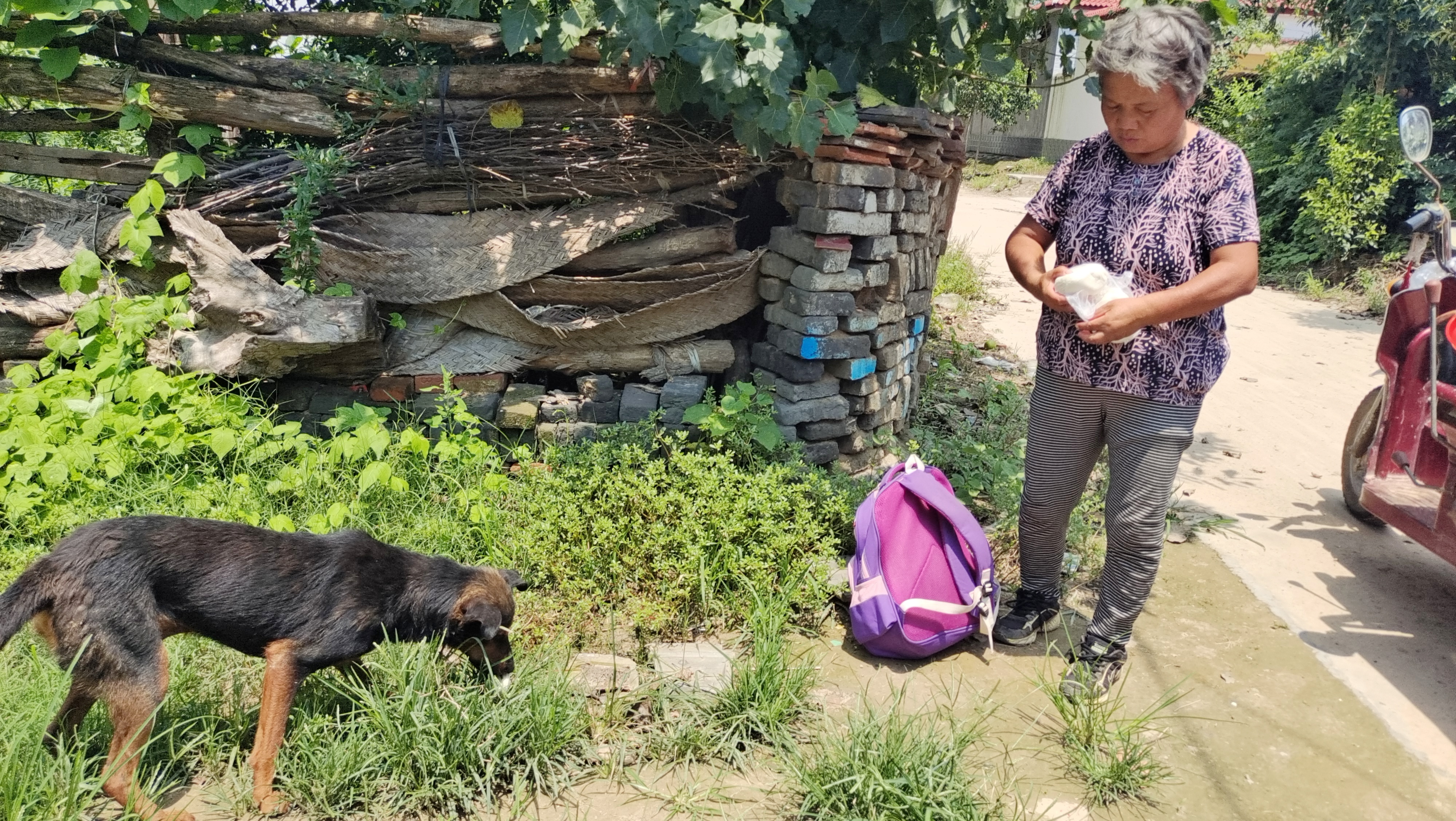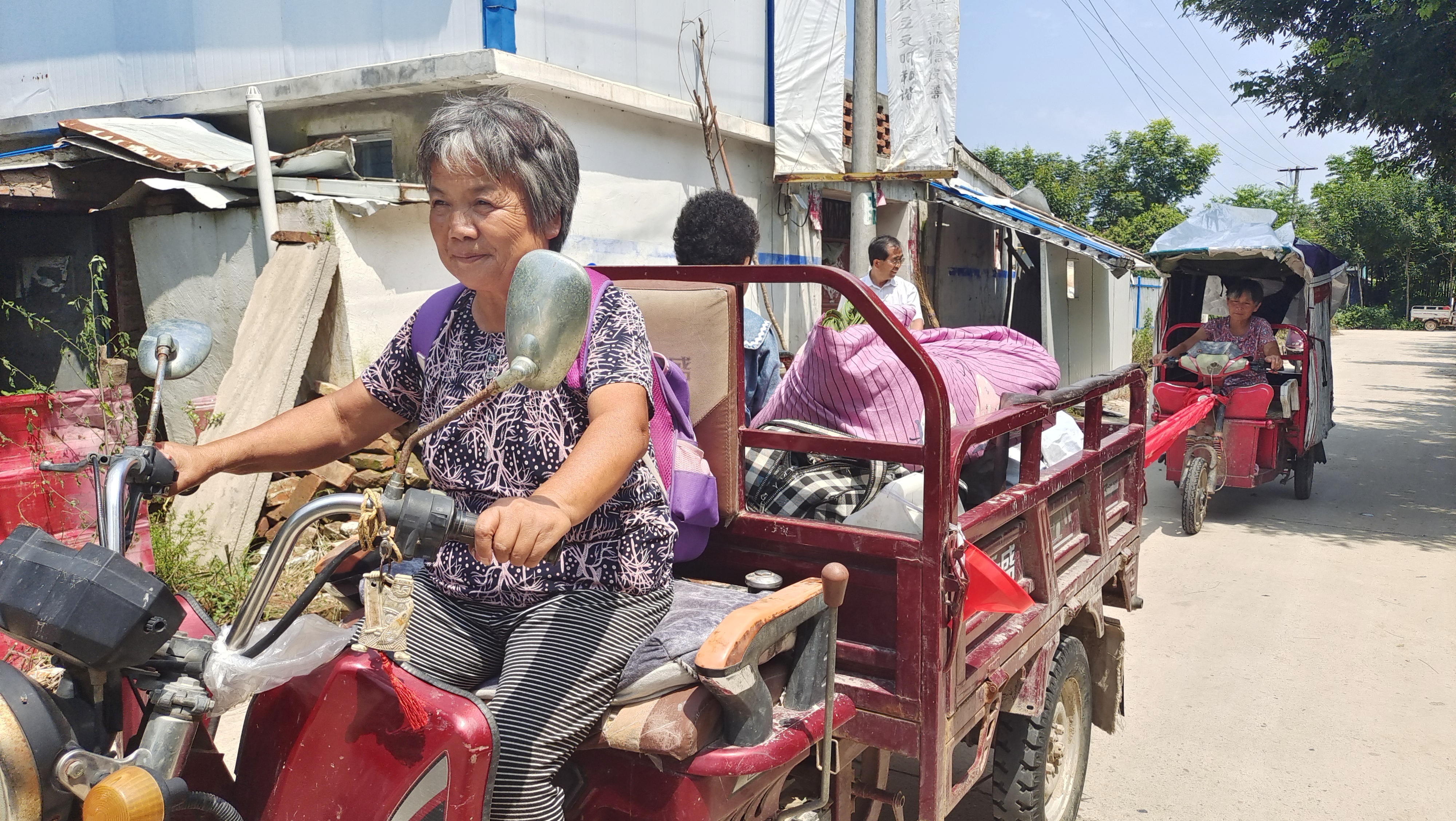 駛出不到幾百米,張梅碰到鄰居王妞的電動三輪車沒電了,這可讓王妞急出一把汗。她們一商量,就在車上找了一段舊條幅,由張梅的機動三輪車牽著王妞的電動三輪車繼續(xù)趕路。