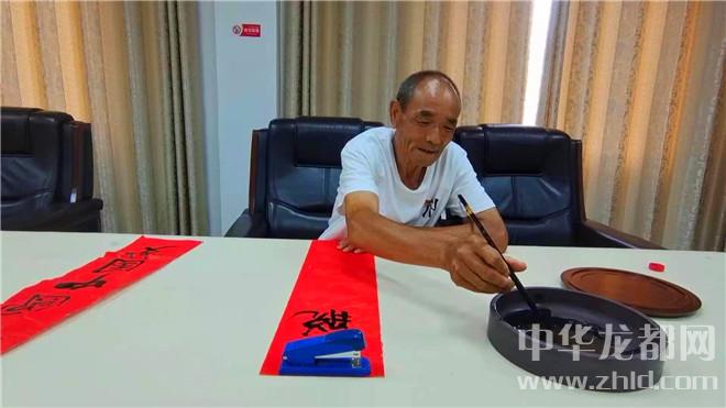 紅色經(jīng)典創(chuàng)作室內(nèi),紅紙精裁,研墨蘸筆。朱再靈與另外兩名黨員商量,一番構(gòu)思后,他揮毫寫下“跟著共產(chǎn)黨共圓中國夢 脫貧致富路齊心奔小康”,筆力蒼勁,對(duì)黨的深情浸透其中。