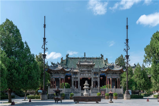 整個古建筑群為仿宮殿式,山門、鐵旗桿、石牌坊、碑亭、饗殿、大殿、河伯殿、炎帝殿、戲樓、拜殿、春秋閣由南向北,建于中軸線上,藥王殿、灶君殿和東廊房,財神殿、酒仙殿及西廊房在前院左右,東西看樓、東西配殿建在中院兩側(cè),老君殿、馬王殿、瘟神殿為東偏房,客房僧舍位于西院。是全國重點文物保護單位,國家AAAA級旅游景區(qū),國家三級博物館。
