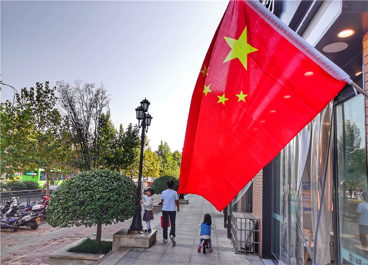 9月30日,市區(qū)臨街商鋪門(mén)前五星紅旗隨處可見(jiàn),紅旗隨風(fēng)飄揚(yáng),將街道裝扮一新,喜迎國(guó)慶節(jié)的到來(lái)