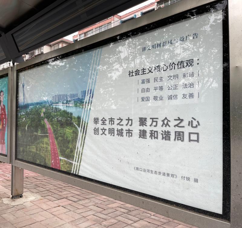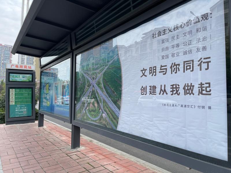周口市公交總公司總經(jīng)理助理朱懷彬表示,為確保文明標語能讓市民抬眼可見、駐足即觀,目前,我市中心城區(qū)公交候車臺的公益廣告牌投放覆蓋率已超過50%?!盁ㄈ灰恍碌墓徽九_,既扮靚了周口的城市面貌,提升了市民的出行體驗,又潛移默化地把社會主義核心價值觀根植于市民內心?!敝鞈驯蛘f。②10