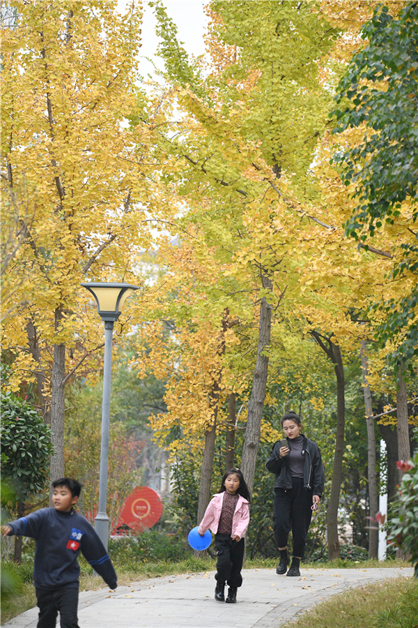 10月31日下午,周口公園的銀杏樹滿樹金黃、披金溢彩,在斑駁的綠樹、紅葉之間,格外美麗,吸引著周末休閑的居民們觀賞游玩。