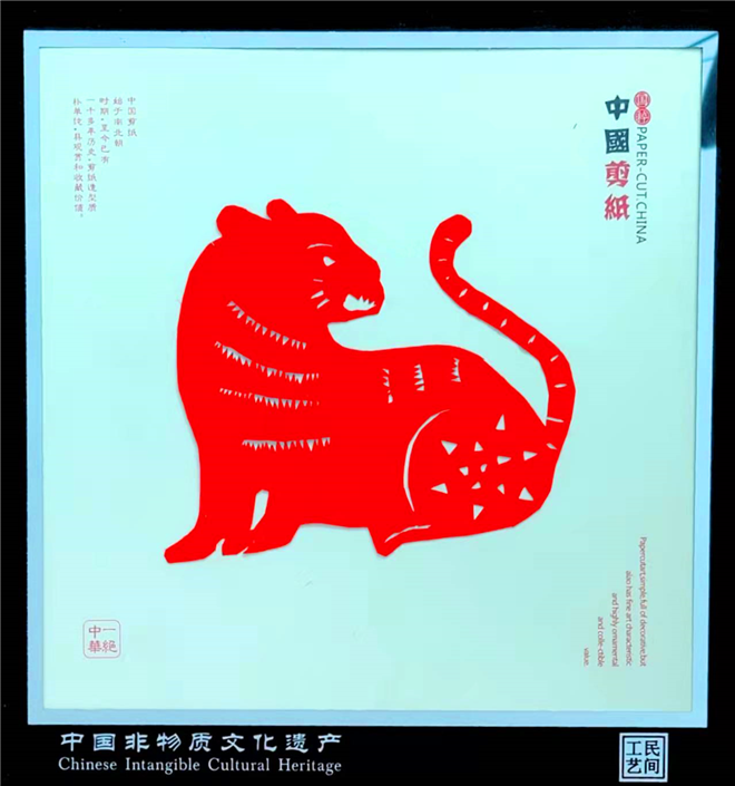 為了慶祝虎年,王春梅創(chuàng)作的秸稈畫(huà)主要有《威震九霄》《虎之王者》《飛天神虎》等,此外,她還創(chuàng)作了兩幅剪紙作品,分別是《虎年組圖》和《虎之2022》。和剪紙作品相比,秸稈畫(huà)制作工序更加復(fù)雜,全憑手工完成,充分利用秸稈本身的紋理和質(zhì)地,結(jié)合顏色、溫度的變化,將畫(huà)面立體的呈現(xiàn)出來(lái)。其中,她創(chuàng)作的部分作品結(jié)合了唐卡的相關(guān)風(fēng)格和顏色配比,比如《威震九霄》中虎的形象所表現(xiàn)出來(lái)的力量感借鑒了唐卡中護(hù)法的力量感;《虎之王者》和《虎之2022》中對(duì)于藍(lán)色的運(yùn)用結(jié)合了唐卡中的藍(lán)色,代表了永恒不變,如同穹蒼攬護(hù)萬(wàn)物之意。