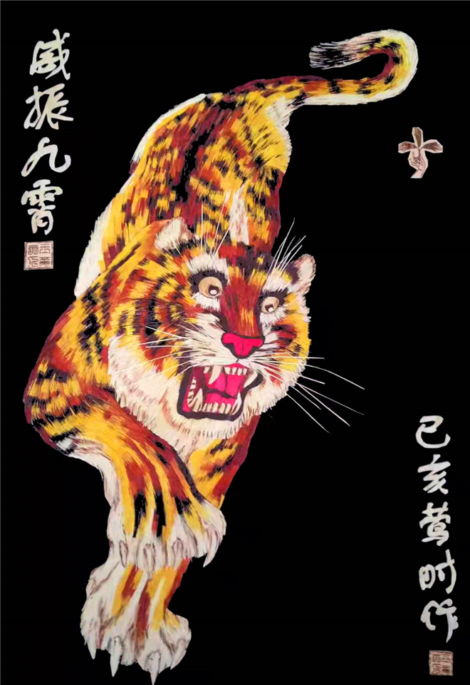 據(jù)王春梅介紹,畫(huà)中老虎身上所有的虎毛全部是用秸稈先染色,然后把這些染好顏色的秸稈用剪刀剪成人頭發(fā)絲一半粗細(xì)的虎毛形狀,再用鑷子一根一根地層層嵌上去,需要盤(pán)絲的毛發(fā)所花費(fèi)的功夫更是成倍地增加。最終所呈現(xiàn)出來(lái)的老虎栩栩如生,極具觀賞性。