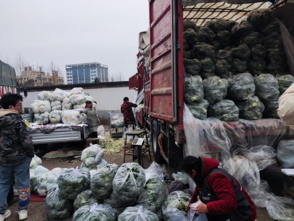 相比于肉類區(qū),蔬菜區(qū)停了很多送貨的小三輪,大多是前來批發(fā)的散戶,大包小包往三輪里裝。據(jù)商販李大姐介紹,臨近春節(jié),天氣寒冷,有一些蔬菜的價格略有上漲,但整體價格并不是很高。她主要是做花菜批發(fā),因為花菜能長期存放,所以價格并不高,只有一塊錢一斤。“價格比之前要低一點(diǎn),但是銷量上升很多,薄利多銷吧。”李大姐說。