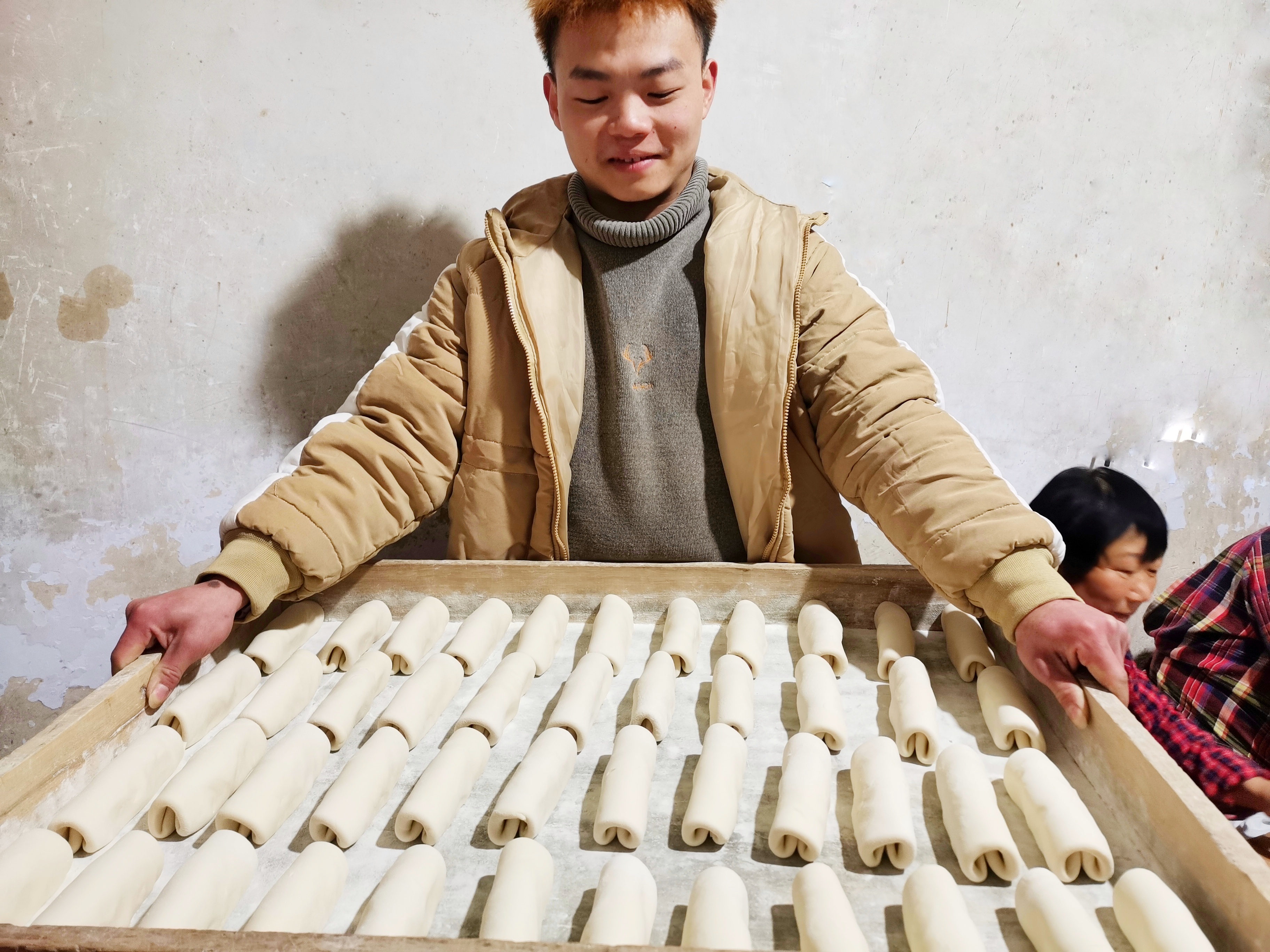 黃家手工杠子饃店,小黃展示剛卷好的杠子饃,即將進(jìn)蒸箱