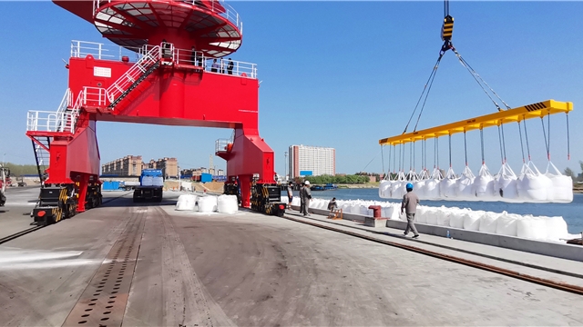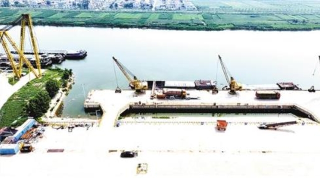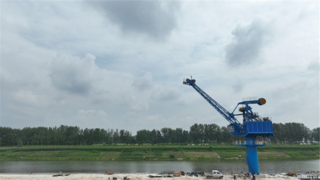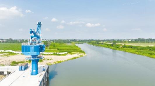 盛夏七月,在項城市東部的項城港,幾架“高聳入云”的新式固定式起重機的主體已安裝完畢,剩余的部件堆放在地上,巨大的框架和鮮紅的涂裝展示著它們的力量。一側(cè),千噸級貨輪正??吭陂L長的泊位前,起重機緩緩卸下貨艙內(nèi)的散貨。