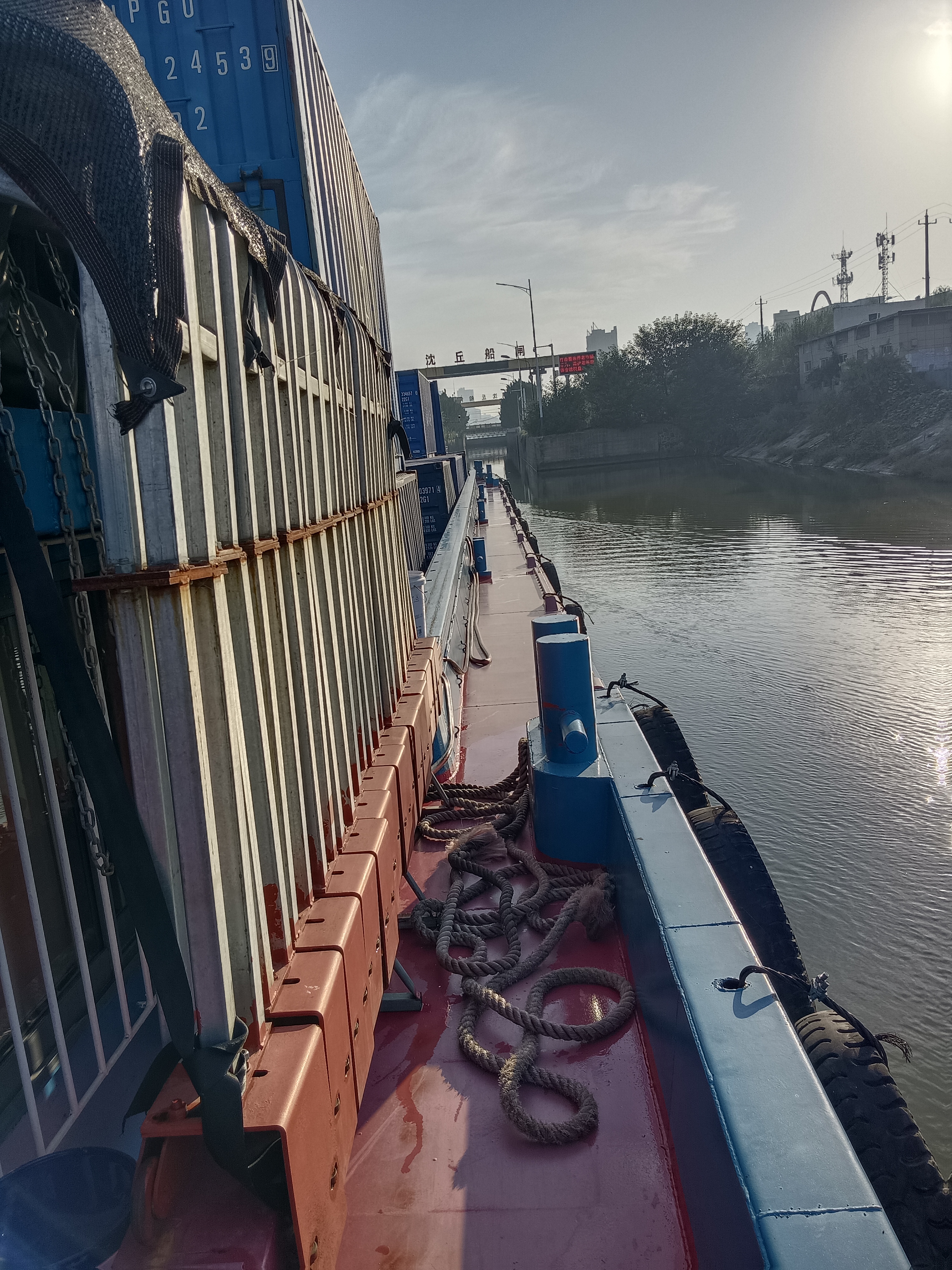 9月25日傍晚,船老大董海軍吊裝好了36個集裝箱,從項城港啟航了。他運送的貨物是純堿,生產(chǎn)玻璃的原材料,目的地是安徽鳳陽港。這次,記者一行從水路出發(fā),隨行采訪。