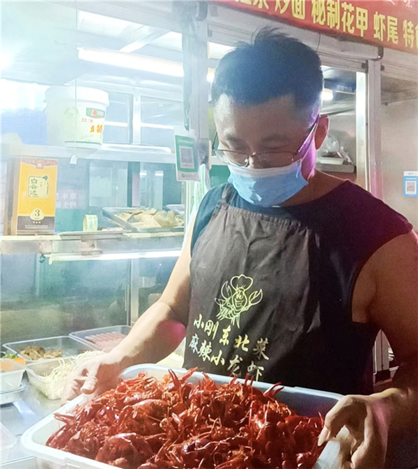 此時(shí),在“東北小剛”麻辣小龍蝦夜攤前,已經(jīng)擺放好了幾張桌子,三五成群的客人相繼前來(lái)落座??腿它c(diǎn)餐后,只見攤主“小剛”就站在操作臺(tái)前,手腳麻利地將提前準(zhǔn)備好的小龍蝦等菜品一一裝盤,然后送到客人面前,忙得不可開交。