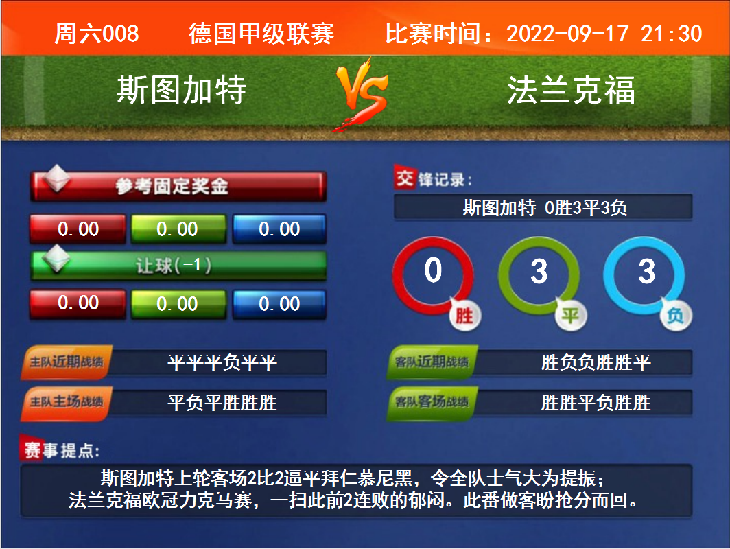 比賽時(shí)間:2022-09-17 21:30賽事提點(diǎn):斯圖加特上輪客場2比2逼平拜仁慕尼黑,令全隊(duì)士氣大為提振;法蘭克福歐冠力克馬賽,一掃此前2連敗的郁悶。此番做客盼搶分而回。