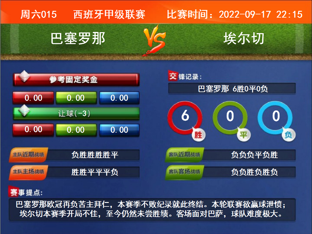 比賽時(shí)間:2022-09-17 22:15賽事提點(diǎn):巴塞羅那歐冠再負(fù)苦主拜仁,本賽季不敗紀(jì)錄就此終結(jié)。本輪聯(lián)賽欲贏球泄憤;埃爾切本賽季開局不佳,至今仍然未嘗勝績??蛨雒鎸Π退_,球隊(duì)難度極大。