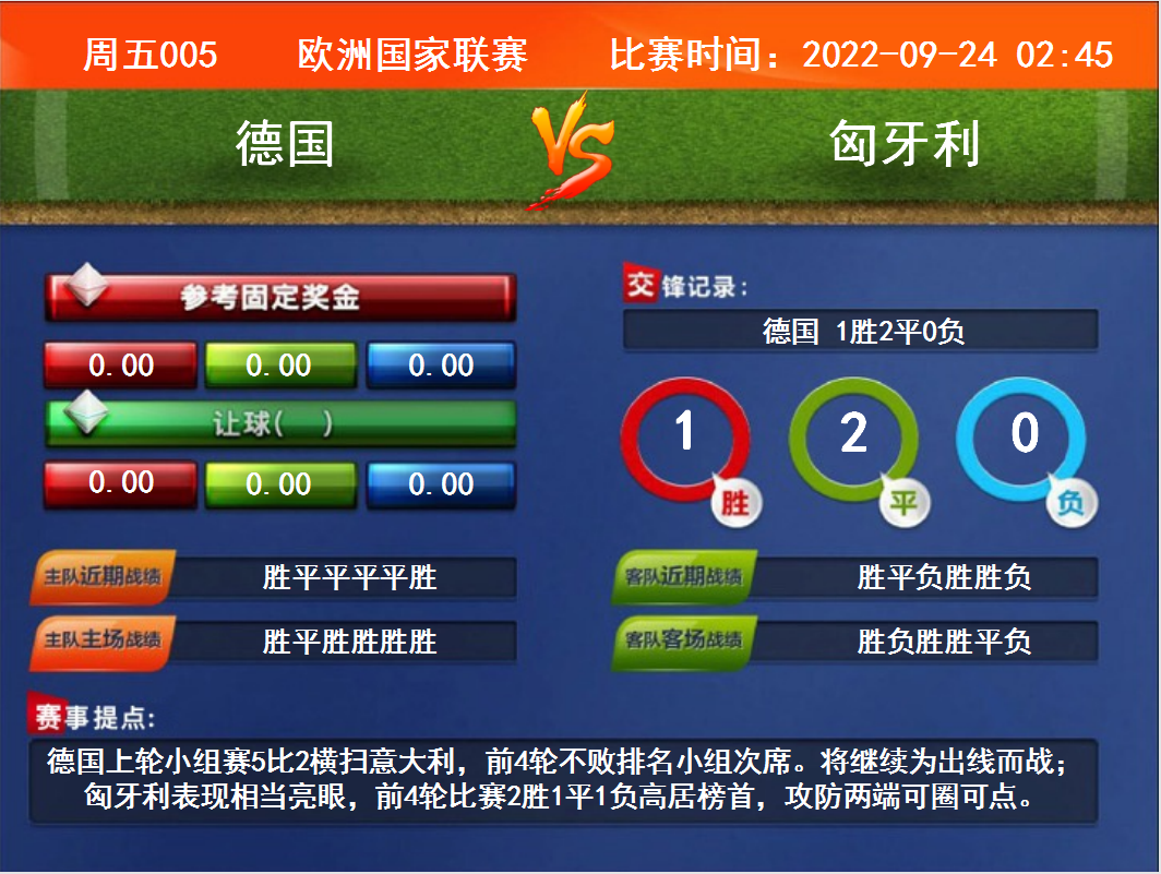 比賽時間:2022-09-24 02:45賽事提點:德國上輪小組賽5比2橫掃意大利,前4輪不敗排名小組次席。將繼續(xù)為出線而戰(zhàn);匈牙利表現(xiàn)相當(dāng)亮眼,前4輪比賽2勝1平1負(fù)高居榜首,攻防兩端可圈可點。