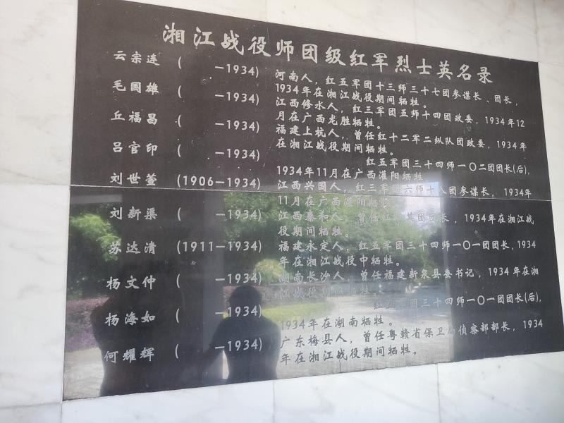 離開烈士英名長廊,記者攀登了184級臺階來到了山頂紀念碑碑亭。在高達34米的紀念碑亭內(nèi),記者意外發(fā)現(xiàn),里面收錄有湘江戰(zhàn)役期間師團級紅軍烈士英名錄碑刻。