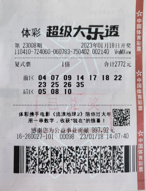 超級(jí)大樂(lè)透第23008期開獎(jiǎng),前區(qū)開出號(hào)碼“04、09、17、22、25”,后區(qū)開出號(hào)碼“01、05”。李先生憑借這張超級(jí)大樂(lè)透中得2注二等獎(jiǎng)74272元,1注三等獎(jiǎng)10000元,60注五等獎(jiǎng)18000元,30注七等獎(jiǎng)3000元,300注八等獎(jiǎng)4500元,550注九等獎(jiǎng)2750元,獎(jiǎng)金合計(jì)112522元。