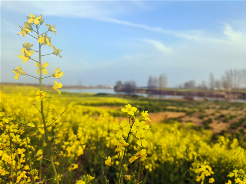 4月2日,春日明媚,沙潁河兩岸一片片金燦燦的油菜花“染黃”了大地,空氣中彌漫著香氣,大片的油菜花和漂亮的村居、田間勞作的農(nóng)民交織在一起,如詩如畫,美不勝收,讓人心曠神怡。