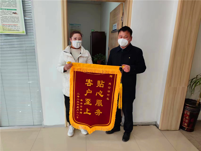 “項城蓮花大道支行的工作人員服務熱情,辦事靠譜,處處為我們著想,錢存在這里,我十分放心!”2月12日,項城市單女士為建行周口分行項城蓮花大道支行送來一面寫有“客戶至上 貼心服務”的錦旗, 對蓮花大道支行全體工作人員的熱情高效、認真負責的工作態(tài)度表示認可和感謝。單女士十分感激地把錦旗遞給了項城蓮花大道支行負責人胡洋洋,并為其點贊。