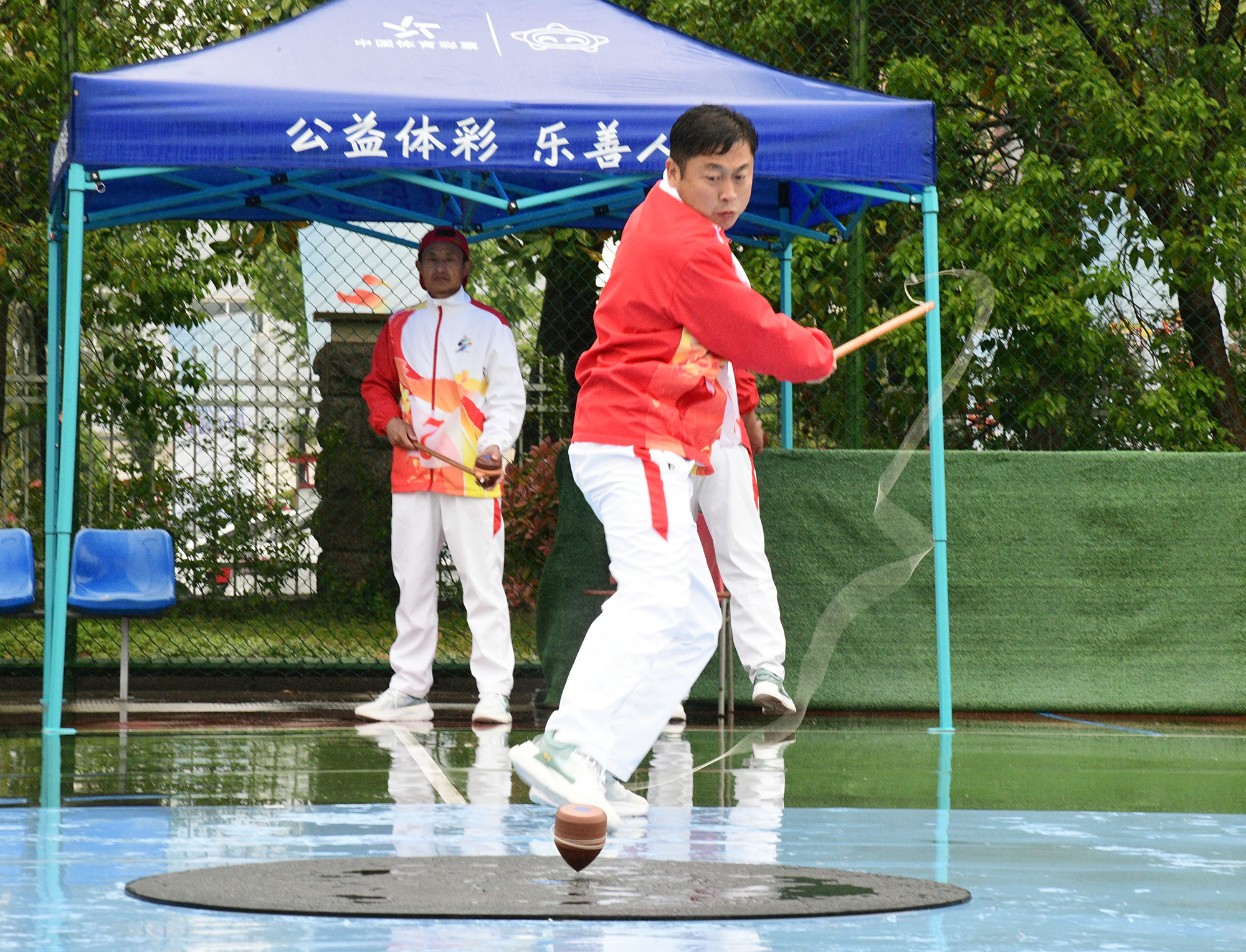 陀螺比賽中,運(yùn)動(dòng)員在放球。記者 梁照曾 攝