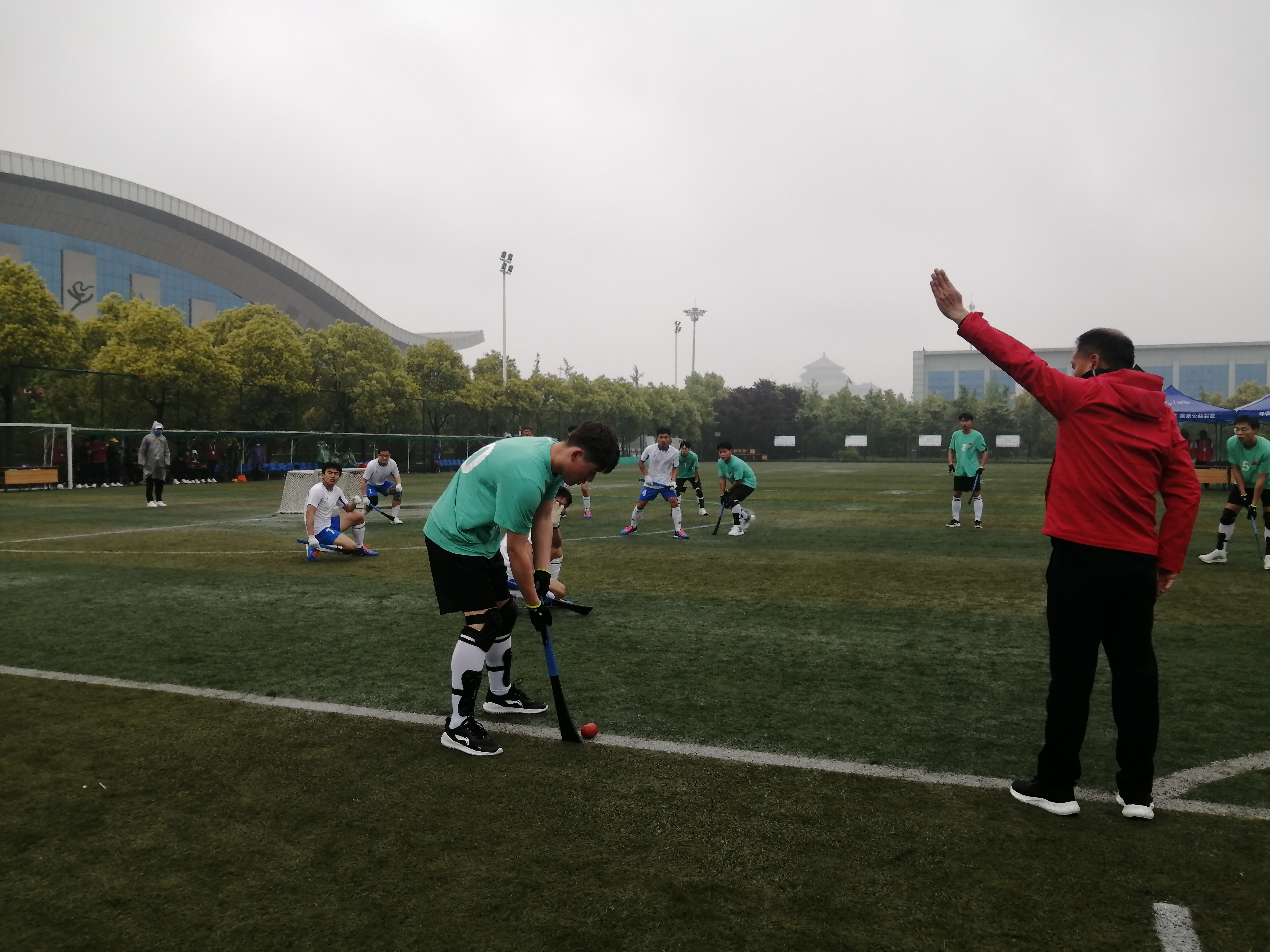 上午8時(shí)30分,淅瀝瀝小雨和大幅降溫讓大家感到非常不適,周口和鄭州兩支代表隊(duì)的10名運(yùn)動(dòng)員卻精神抖擻齊聚賽場。隨著一聲哨響比賽開始,兩隊(duì)球員揮動(dòng)擊球板擊打木球,一場激烈比賽便開始了。