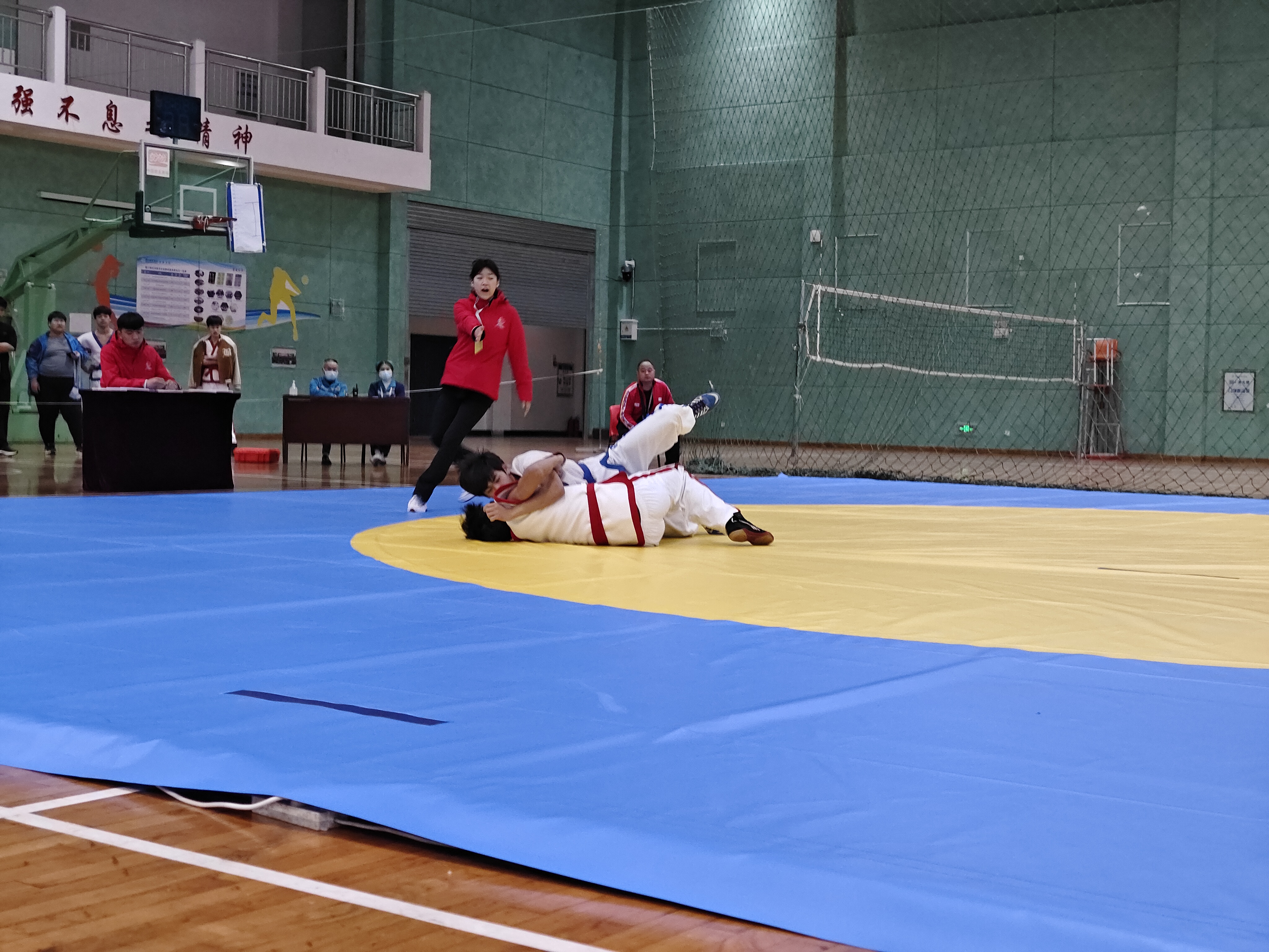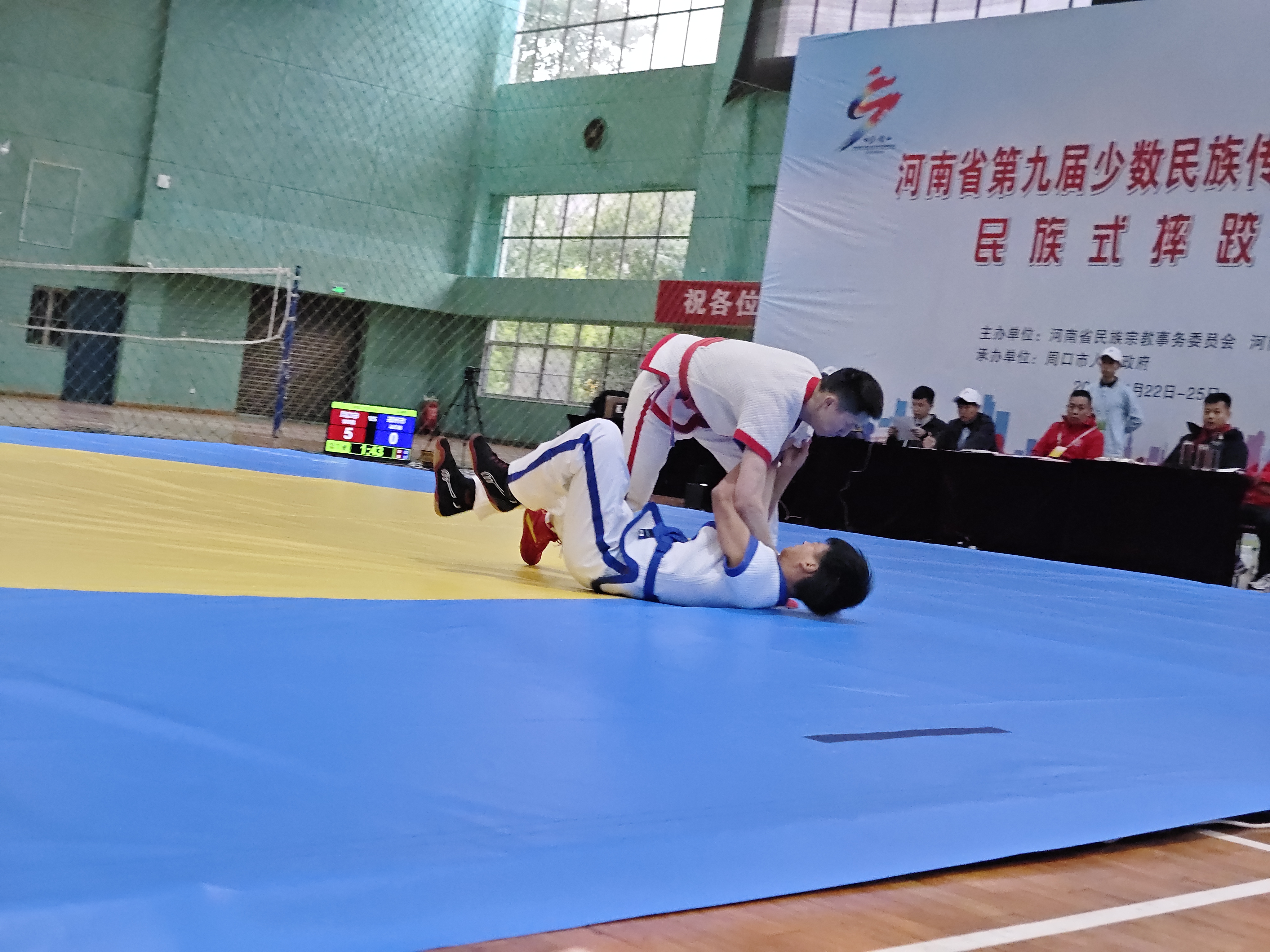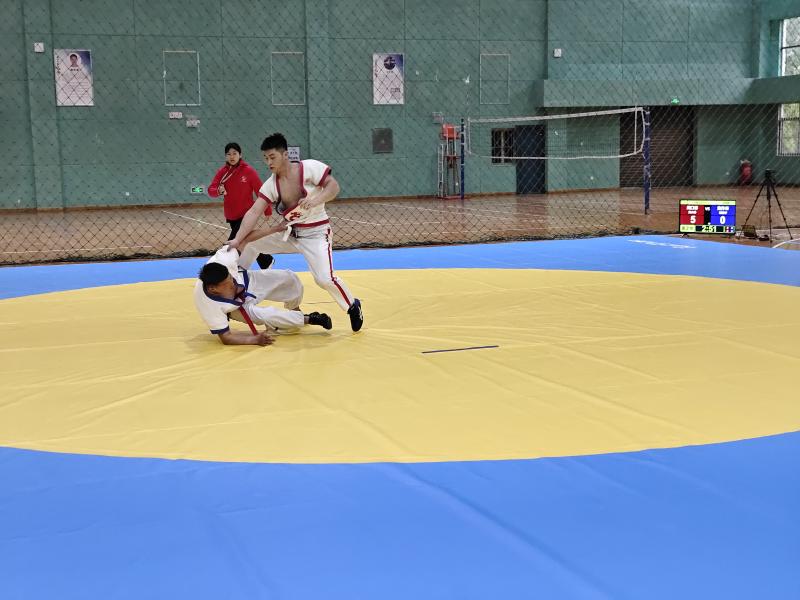 當(dāng)日,河南省第九屆少數(shù)民族傳統(tǒng)體育運(yùn)動(dòng)會民族式摔跤競賽項(xiàng)目在周口師范學(xué)院老體育館開賽。絆跤是首個(gè)登場的跤種,9支代表隊(duì)參賽。該跤種以體重級別分組進(jìn)行雙敗淘汰賽,共有52kg、62kg、74kg、87kg和87kg以上等5個(gè)公斤級,對應(yīng)5個(gè)一等獎(jiǎng)。經(jīng)過激烈角逐,來自漯河市、周口市和河南大學(xué)代表隊(duì)的5名選手獲得一等獎(jiǎng),我市選手李祥楷、劉小濤分別獲62kg、87kg一等獎(jiǎng)。
