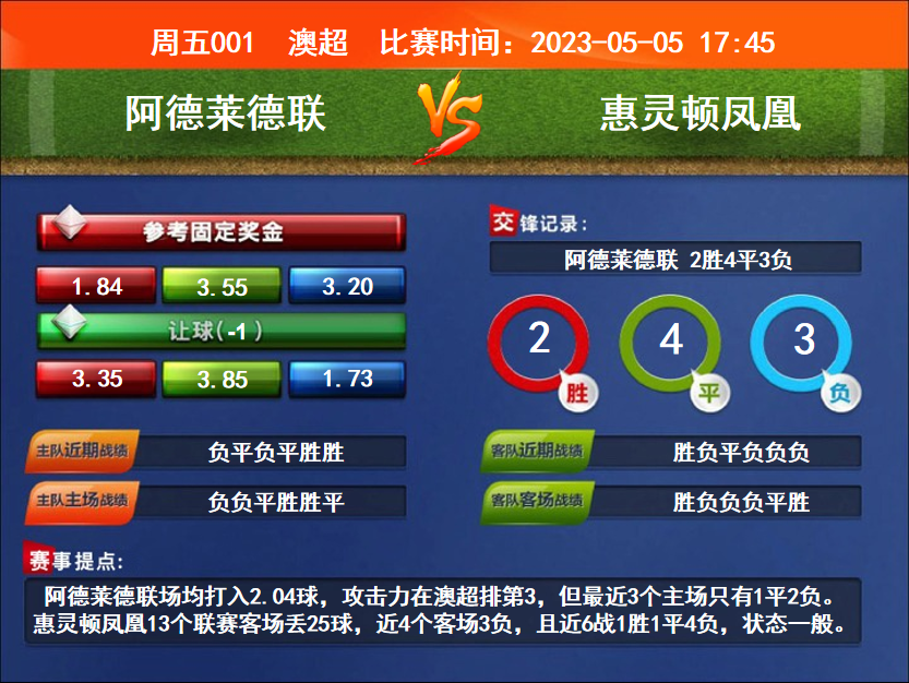 比賽時(shí)間:2023-05-05 17:45賽事提點(diǎn):阿德萊德聯(lián)場(chǎng)均打入2.04球,攻擊力在澳超排第3,但最近3個(gè)主場(chǎng)只有1平2負(fù)。惠靈頓鳳凰13個(gè)聯(lián)賽客場(chǎng)丟25球,近4個(gè)客場(chǎng)3負(fù),且近6戰(zhàn)1勝1平4負(fù),狀態(tài)一般。