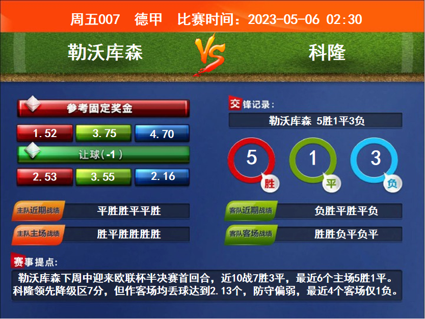 比賽時(shí)間:2023-05-06 02:30賽事提點(diǎn):勒沃庫(kù)森下周中迎來歐聯(lián)杯半決賽首回合,近10戰(zhàn)7勝3平,最近6個(gè)主場(chǎng)5勝1平。科隆領(lǐng)先降級(jí)區(qū)7分,但作客場(chǎng)均丟球達(dá)到2.13個(gè),防守偏弱,最近4個(gè)客場(chǎng)僅1負(fù)。
