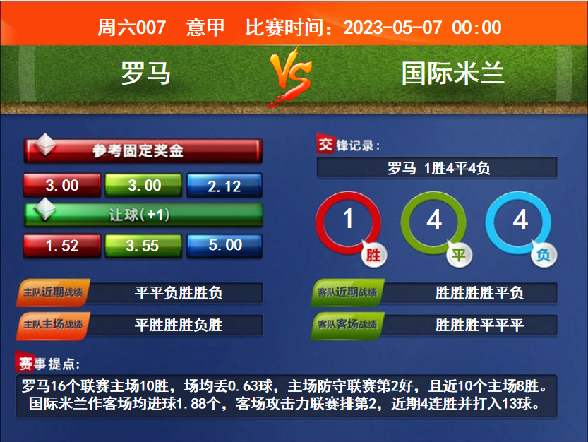 比賽時間:2023-05-07 00:00賽事提點:羅馬16個聯(lián)賽主場10勝,場均丟0.63球,主場防守聯(lián)賽第2好,且近10個主場8勝。國際米蘭作客場均進球1.88個,客場攻擊力聯(lián)賽排第2,近期4連勝并打入13球。