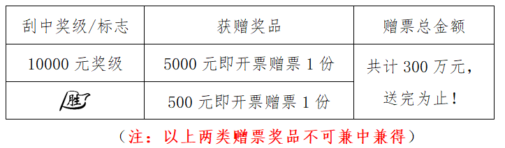 活動(dòng)期間,購(gòu)彩者在河南省范圍內(nèi)任一體彩銷售實(shí)體店購(gòu)買指定活動(dòng)票種,若單張彩票刮中符合獎(jiǎng)勵(lì)條件的獎(jiǎng)級(jí)或標(biāo)志,經(jīng)實(shí)體店終端兌獎(jiǎng)設(shè)備成功完成獎(jiǎng)金兌付及促銷兌獎(jiǎng)掃描后,即可獲得即開票贈(zèng)票獎(jiǎng)品一份??傤~有限,送完為止,詳見下表: