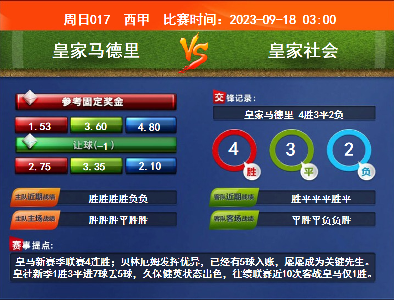 比賽時間:2023-09-18 03:00賽事提點:皇馬新賽季聯(lián)賽4連勝;貝林厄姆發(fā)揮優(yōu)異,已經(jīng)有5球入賬,屢屢成為關鍵先生。皇社新季1勝3平進7球丟5球,久保健英狀態(tài)出色,往績聯(lián)賽近10次客戰(zhàn)皇馬僅1勝。