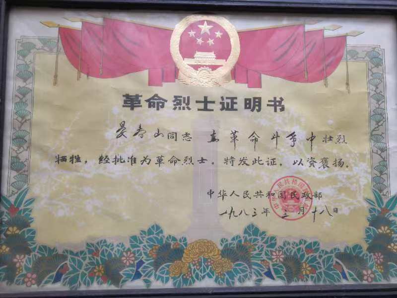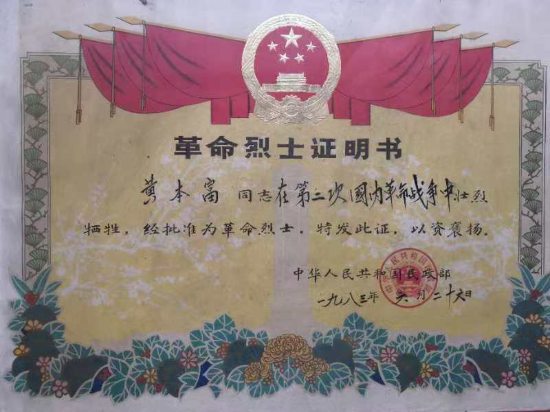 黃德耀的小爺爺黃成香于1935年3月在哥哥黃本富犧牲后的第2個月參加紅軍。1940年,黃成香在安徽省定遠(yuǎn)縣對日軍戰(zhàn)斗中英勇犧牲,尸骨無存,年僅17歲。