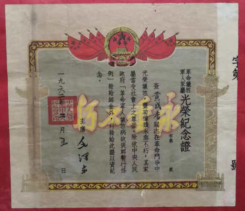 黃成香革命犧牲軍人家屬光榮紀(jì)念證。