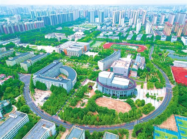 六月二十四日上午,鳥(niǎo)瞰周口師范學(xué)院校區(qū),曲折小道環(huán)抱音樂(lè)廳、大禮堂、圖書(shū)館等建筑,宛若一把巨大的琵琶,在中心城區(qū)奏響文明發(fā)展進(jìn)行曲。