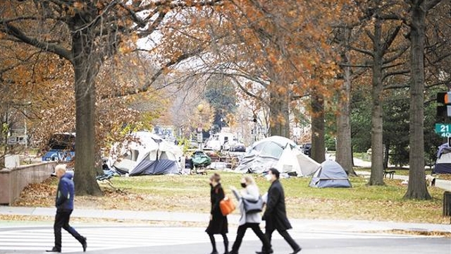 12月8日,在美國華盛頓,行人經(jīng)過無家可歸者居住的帳篷?!?a href="http://www.ynckhj.com/content/2021-12/11/content_962080.html" target="_blank" >[詳細(xì)]